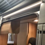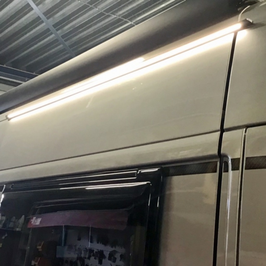 Regengoot met LED verlichting, dat wordt gezellig buiten zitten bij uw buscamper. Als deze verlichting gemonteerd is heeft u prachtig en dimbaar licht over de hele breedte van de deur. Doordat de verlichting dimbaar is kunt u zelf bepalen hoeveel licht u op dat moment nodig heeft. De geïntegreerde regengoot voorkomt waterdruppels in het voertuig indien de deur geopend is.