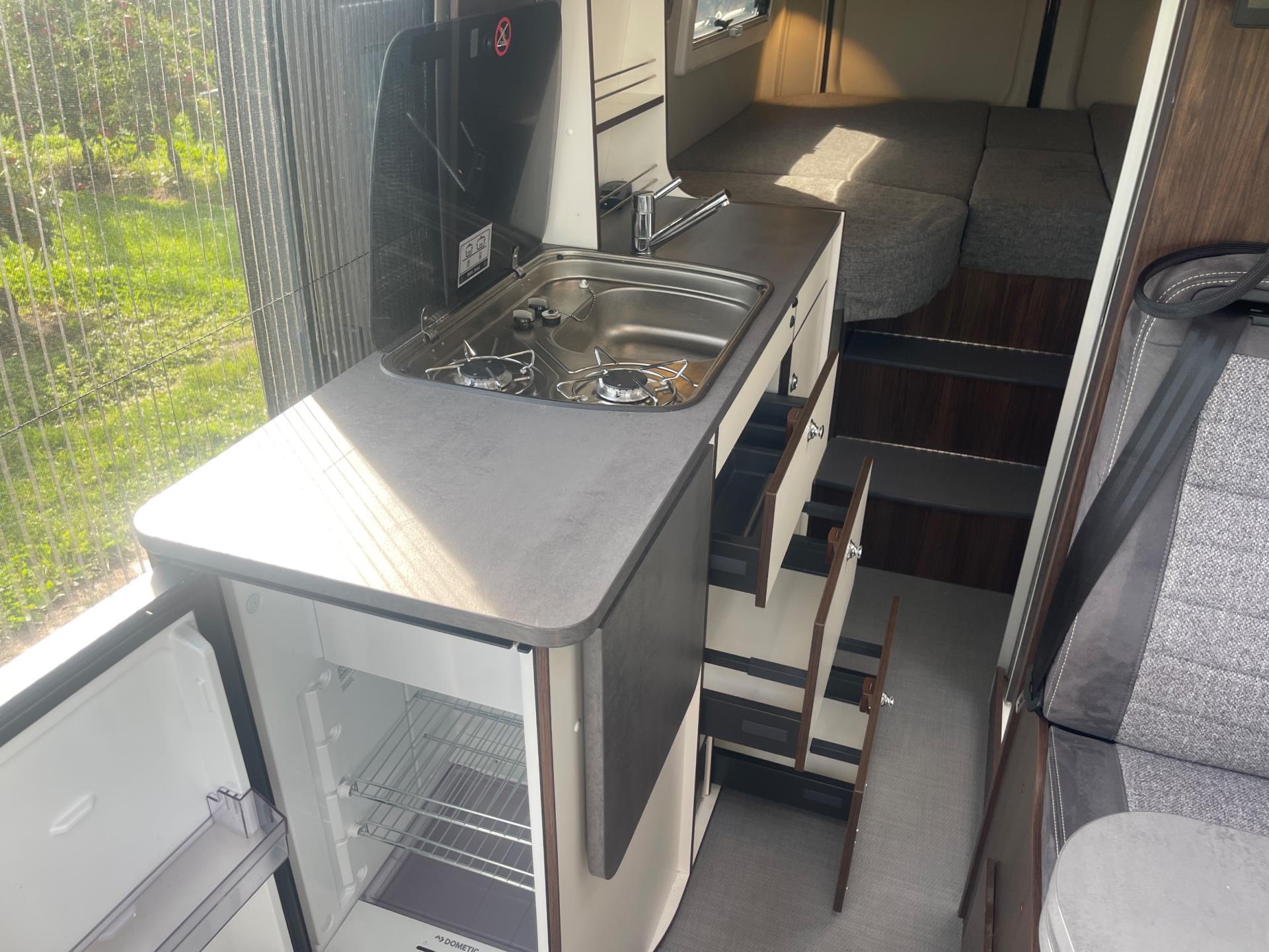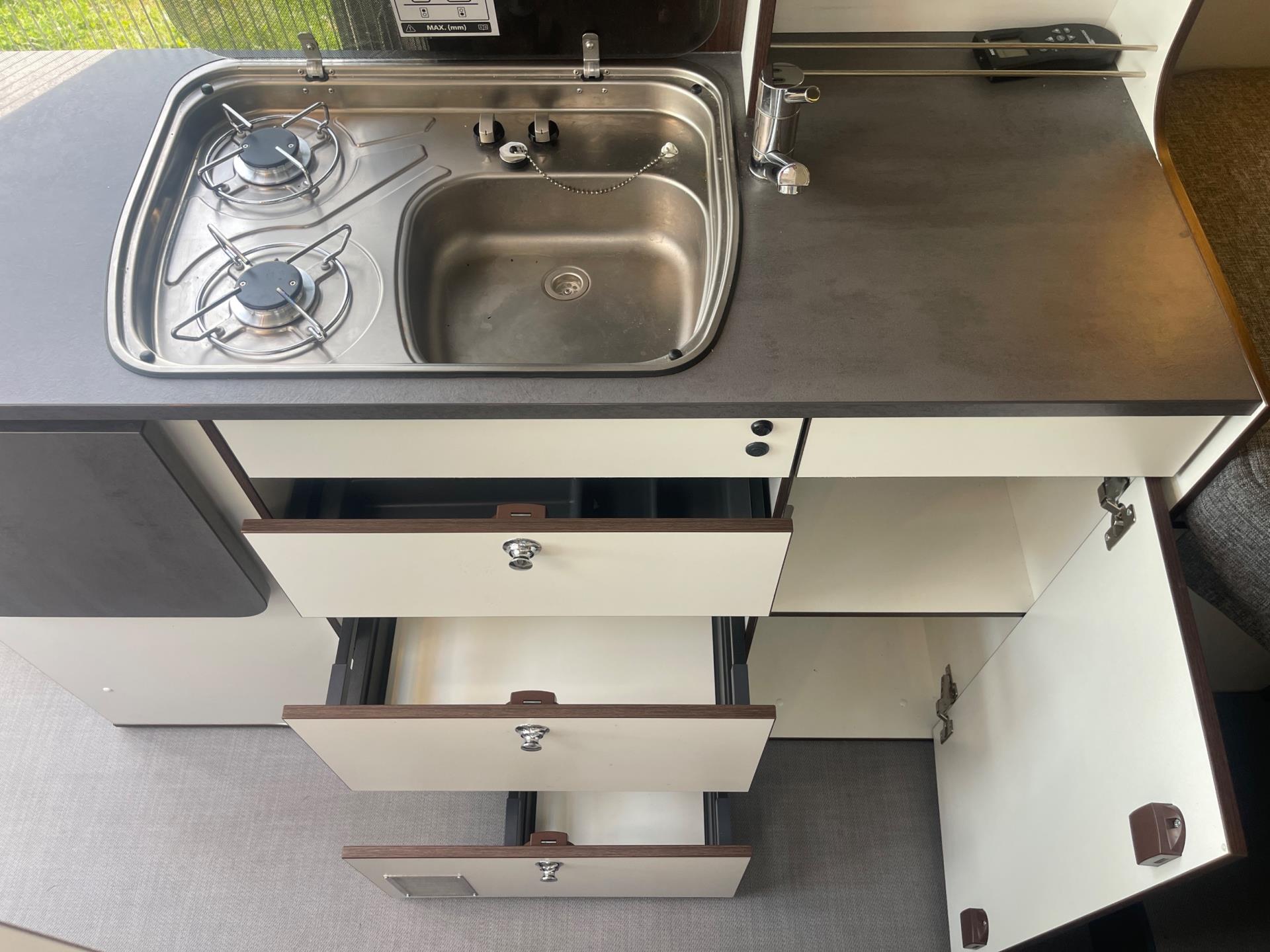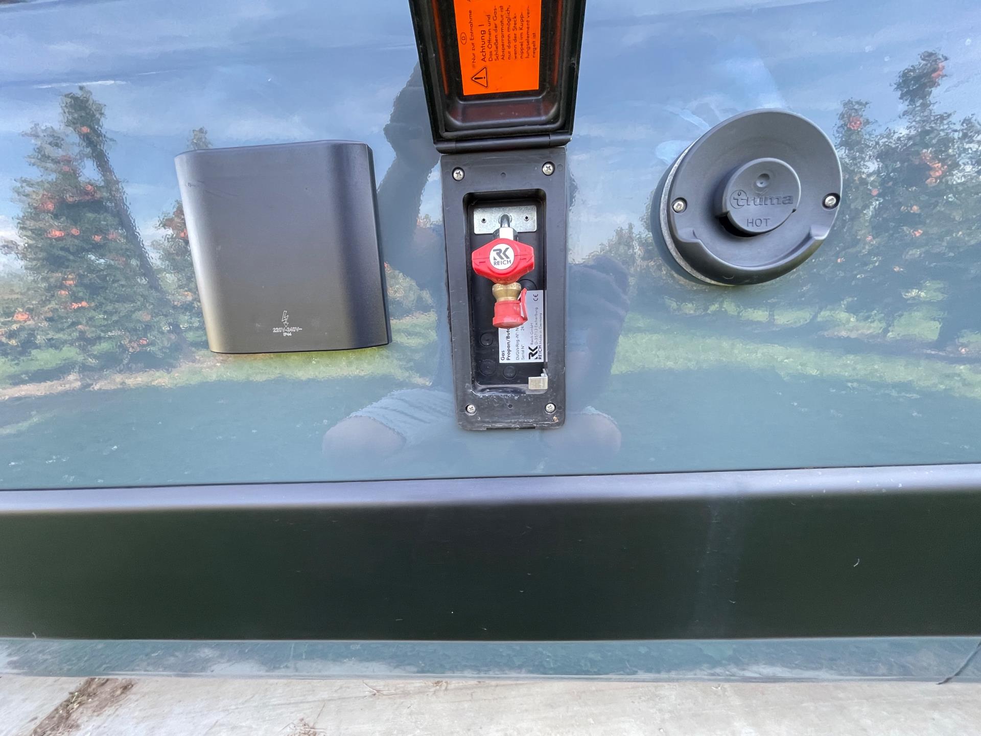 - Externe gasaansluiting voor het koken en 2 aluminium gasflessen 11 kg, met externe tankmogelijkheid, zodat je nooit meer flessen hoeft te wisselen.