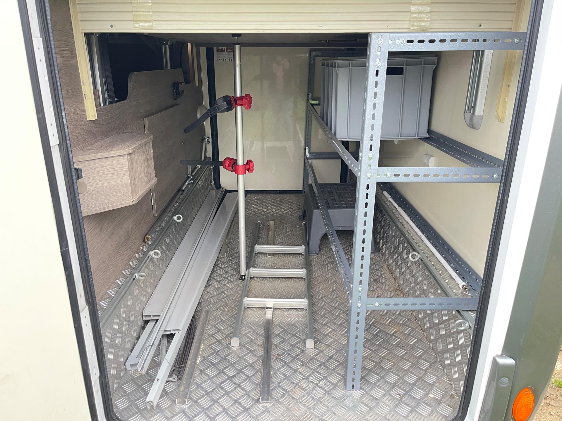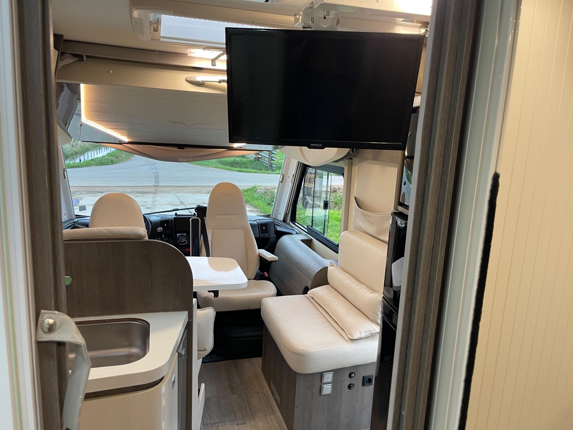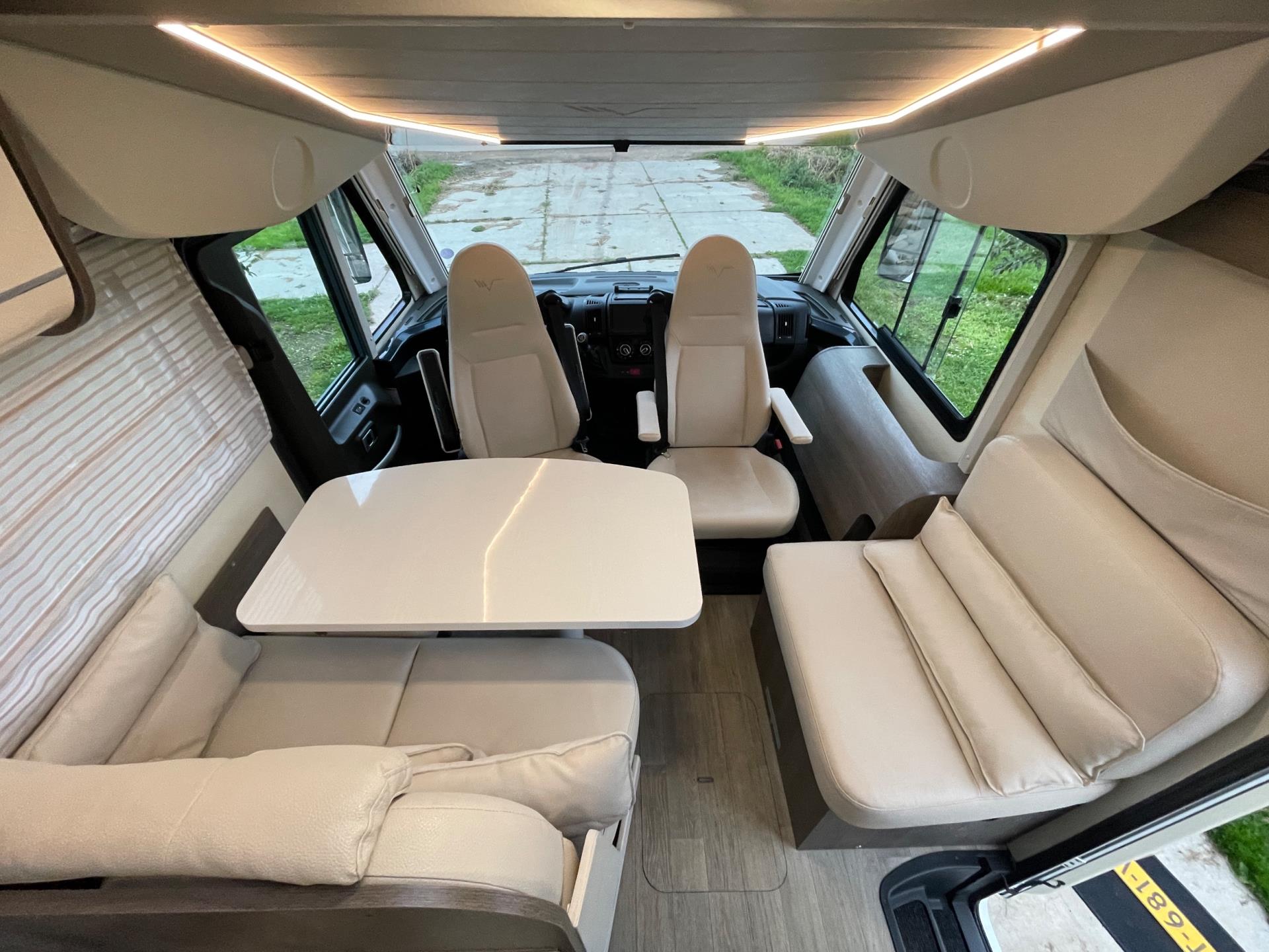 Airco woongedeelte, witte leren bekleding, televisie, schotel, zonnepaneel, fietsenrek, oven, xl koelkast + vriesvak, centrale deurvergrendeling, geurventilatie toilet, luifel, Zenec audiosysteem (nieuw) met achterrijcamara en Apple CarPlay. Indeling van de camper Zeer moderne interieur: Slaapgedeelte, Queens bed, aan beide zijde hangkasten + nachtkastjes met opbergruimte. Leeslampjes + sfeerverlichting achter het bed. Opbergruimte onder het bed. Schuifdeur om slaapgedeelte af te sluiten. Aparte douche en toilet. Schuifdeur tussen woon en wasgedeelte. Keuken 2x apothekerkasten, boven en onderkasten + besteklade, 3 pits gas toestel. Xl koelkast + extra vriesvak, gasoven. Woongedeelte: 2 banken met leren kussens, 2 verstelbare stoelen + verstelbare tafel. Verduisterend schuifsysteem voor ramen + extra zonsverduistering tijdens het rijden. 2 opbergvakken in de vloer. Hefbed met verlichting. Camper is voorzien van overal mooie sfeerverlichting. XL garage. Buitenverlichting, luifel en stopcontact buiten incl. Tv aansluiting