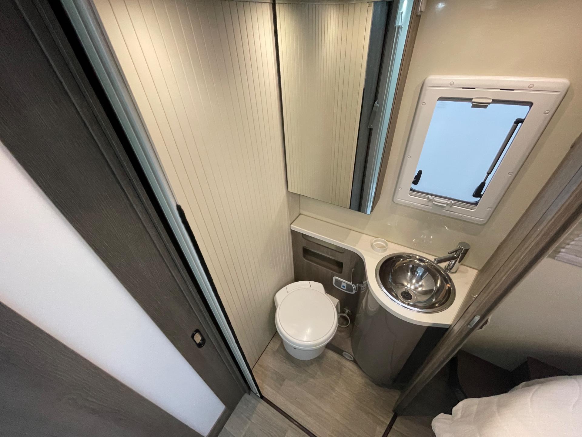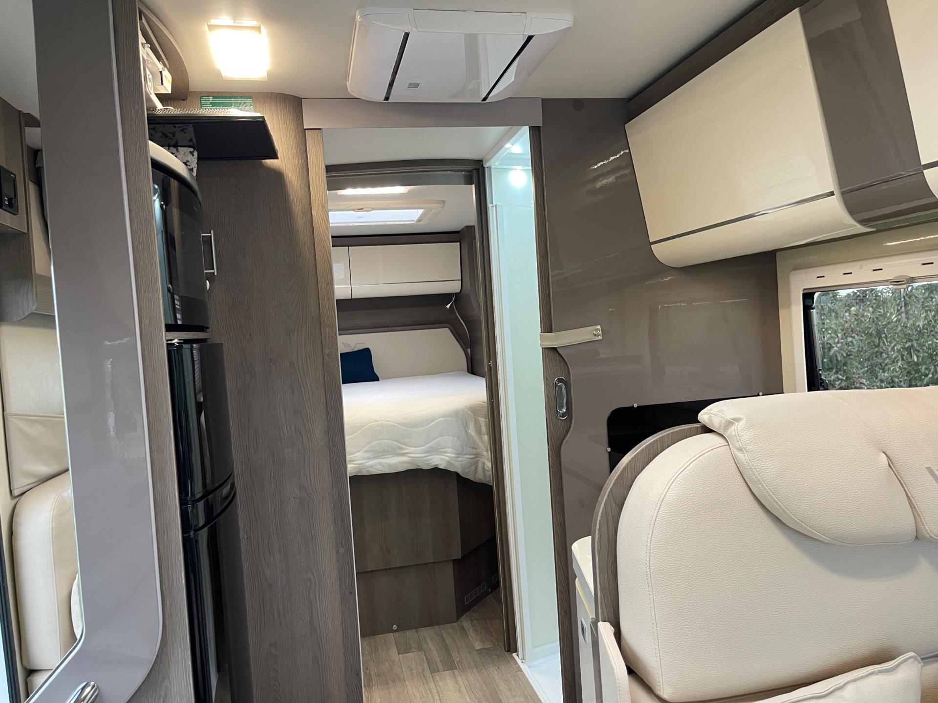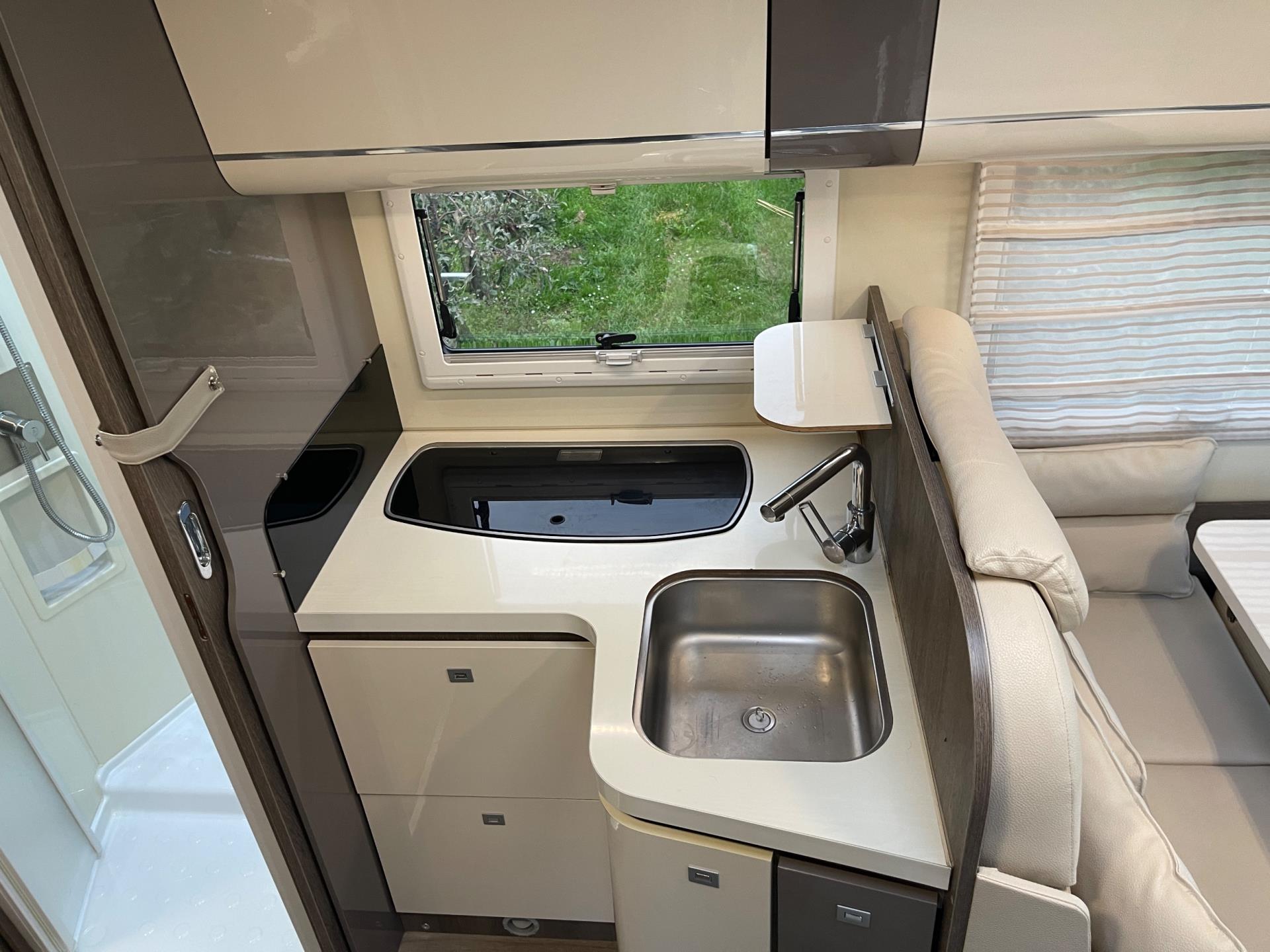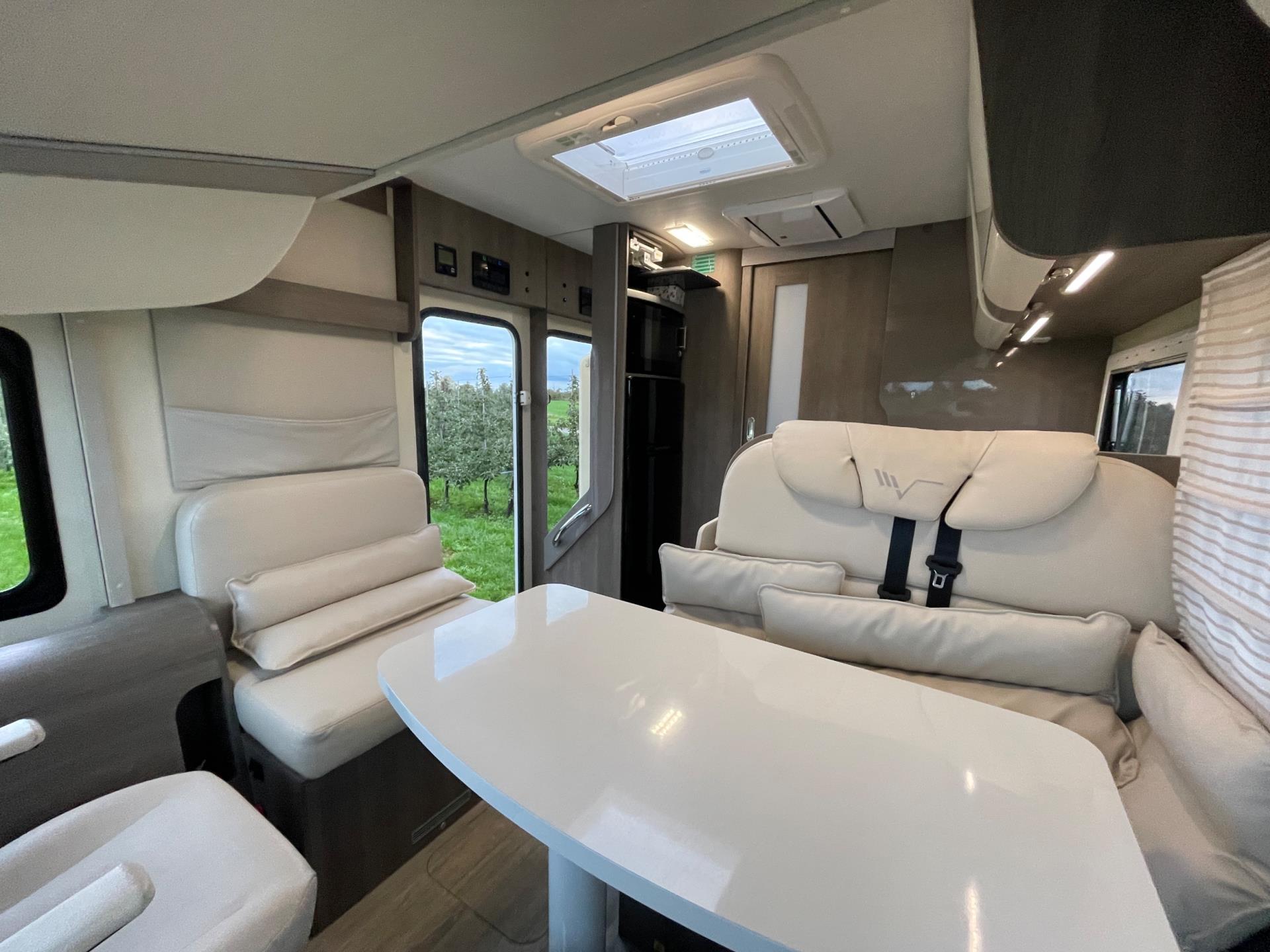 Airco woongedeelte, witte leren bekleding, televisie, schotel, zonnepaneel, fietsenrek, oven, xl koelkast + vriesvak, centrale deurvergrendeling, geurventilatie toilet, luifel, Zenec audiosysteem (nieuw) met achterrijcamara en Apple CarPlay. Indeling van de camper Zeer moderne interieur: Slaapgedeelte, Queens bed, aan beide zijde hangkasten + nachtkastjes met opbergruimte. Leeslampjes + sfeerverlichting achter het bed. Opbergruimte onder het bed. Schuifdeur om slaapgedeelte af te sluiten. Aparte douche en toilet. Schuifdeur tussen woon en wasgedeelte. Keuken 2x apothekerkasten, boven en onderkasten + besteklade, 3 pits gas toestel. Xl koelkast + extra vriesvak, gasoven. Woongedeelte: 2 banken met leren kussens, 2 verstelbare stoelen + verstelbare tafel. Verduisterend schuifsysteem voor ramen + extra zonsverduistering tijdens het rijden. 2 opbergvakken in de vloer. Hefbed met verlichting. Camper is voorzien van overal mooie sfeerverlichting. XL garage. Buitenverlichting, luifel en stopcontact buiten incl. Tv aansluiting