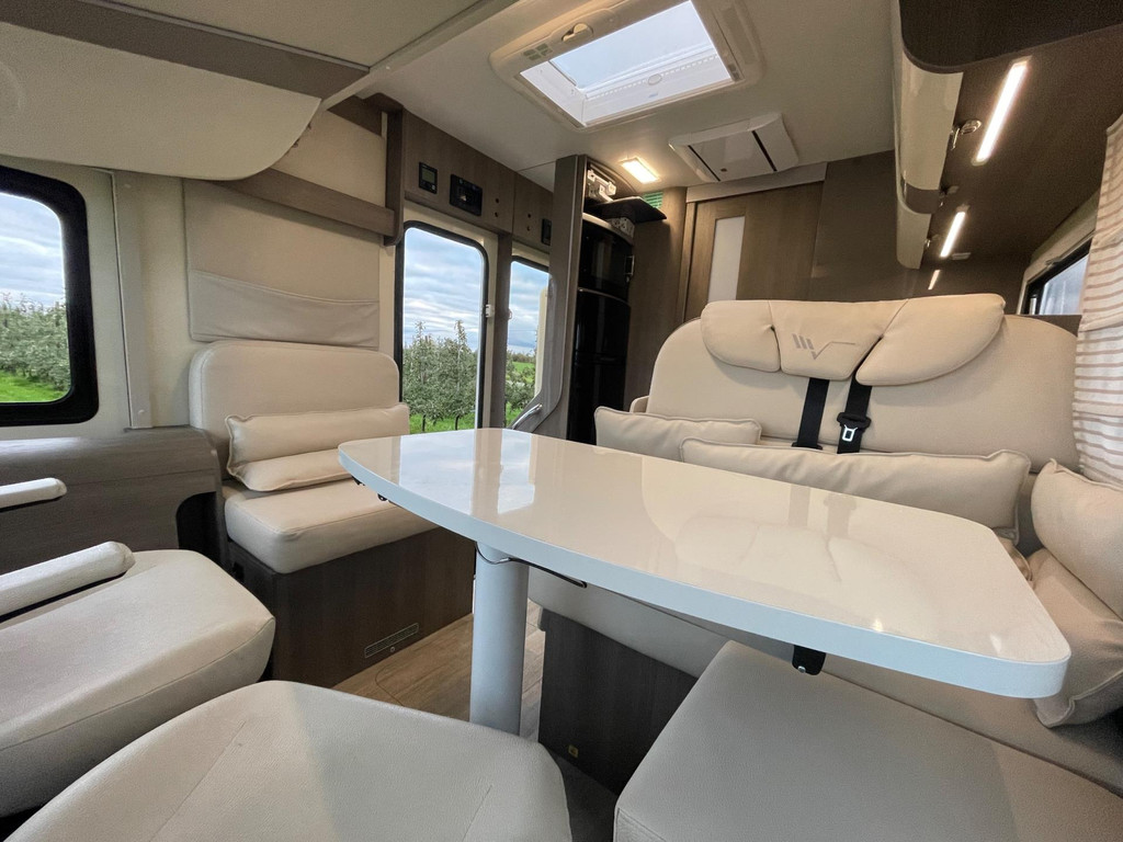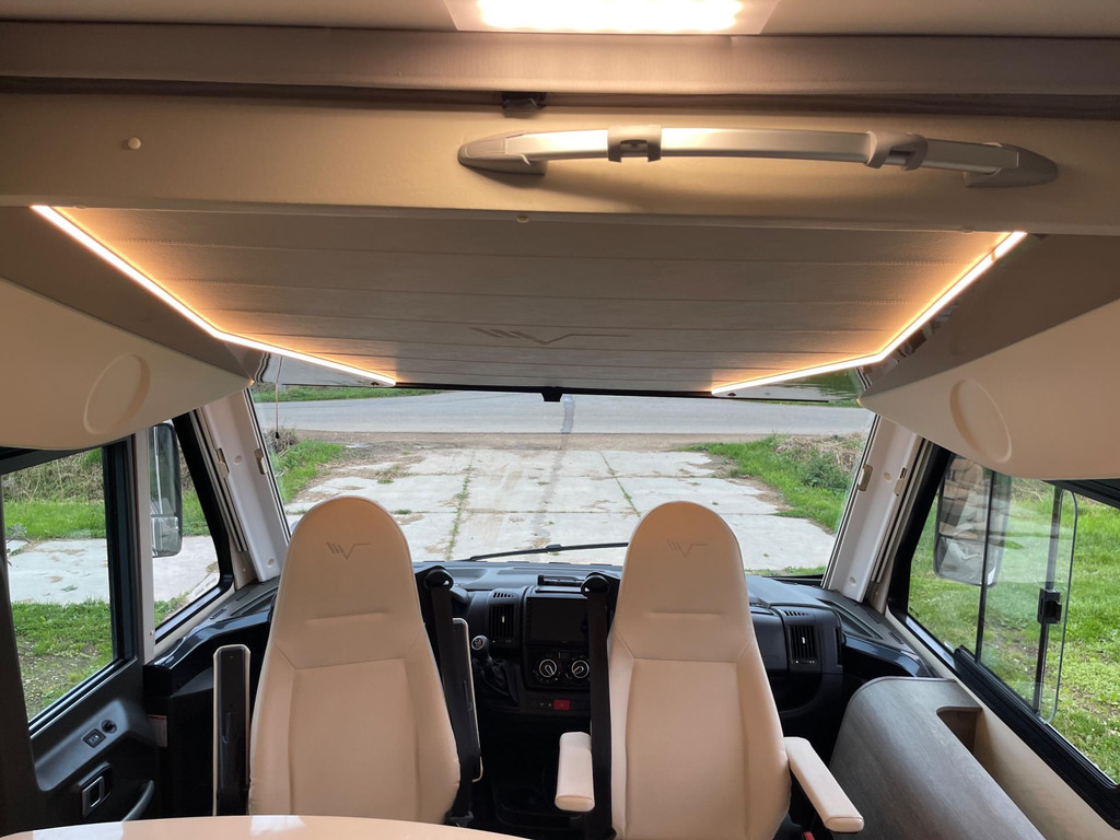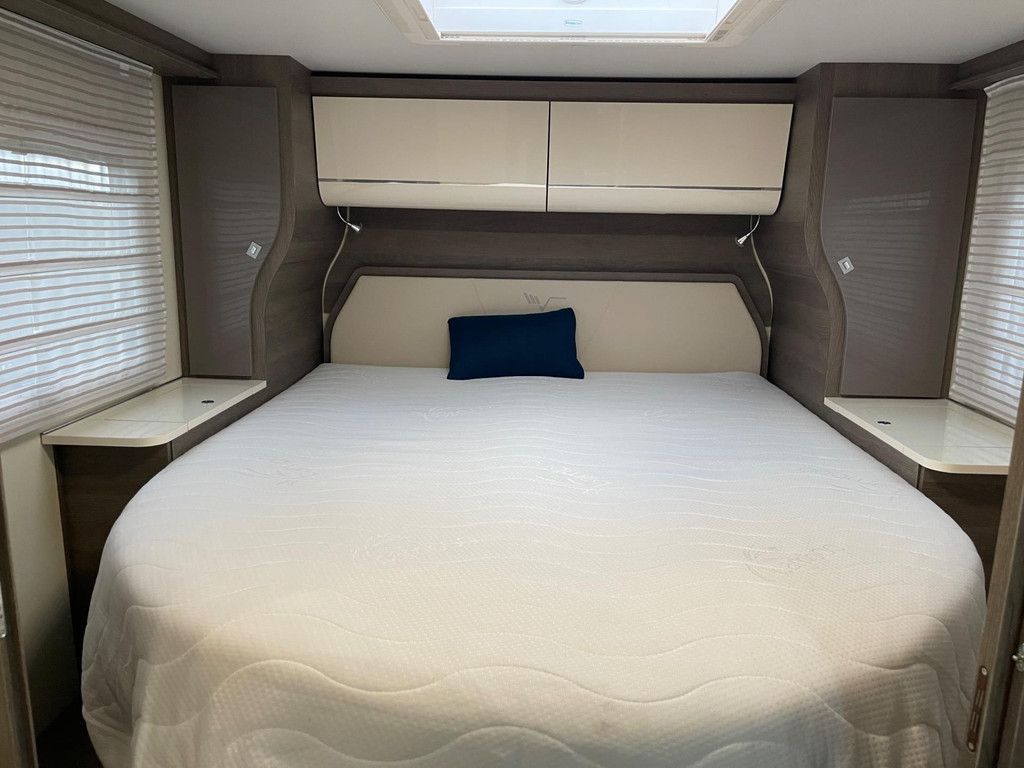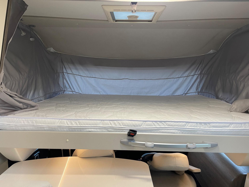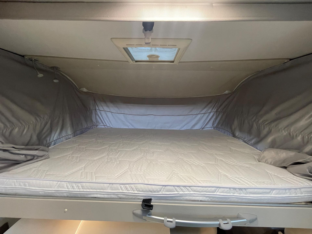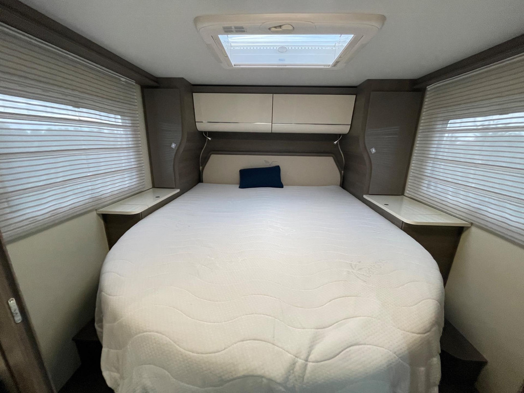 Airco woongedeelte, witte leren bekleding, televisie, schotel, zonnepaneel, fietsenrek, oven, xl koelkast + vriesvak, centrale deurvergrendeling, geurventilatie toilet, luifel, Zenec audiosysteem (nieuw) met achterrijcamara en Apple CarPlay. Indeling van de camper Zeer moderne interieur: Slaapgedeelte, Queens bed, aan beide zijde hangkasten + nachtkastjes met opbergruimte. Leeslampjes + sfeerverlichting achter het bed. Opbergruimte onder het bed. Schuifdeur om slaapgedeelte af te sluiten. Aparte douche en toilet. Schuifdeur tussen woon en wasgedeelte. Keuken 2x apothekerkasten, boven en onderkasten + besteklade, 3 pits gas toestel. Xl koelkast + extra vriesvak, gasoven. Woongedeelte: 2 banken met leren kussens, 2 verstelbare stoelen + verstelbare tafel. Verduisterend schuifsysteem voor ramen + extra zonsverduistering tijdens het rijden. 2 opbergvakken in de vloer. Hefbed met verlichting. Camper is voorzien van overal mooie sfeerverlichting. XL garage. Buitenverlichting, luifel en stopcontact buiten incl. Tv aansluiting