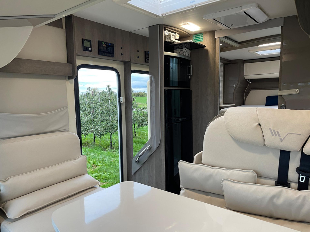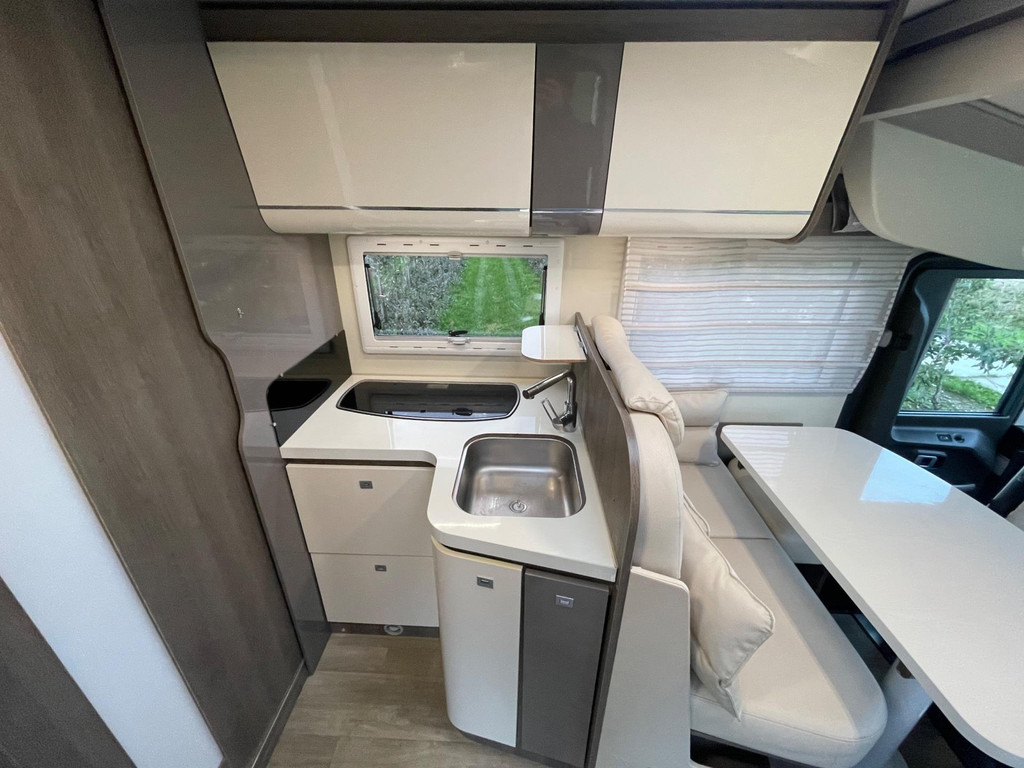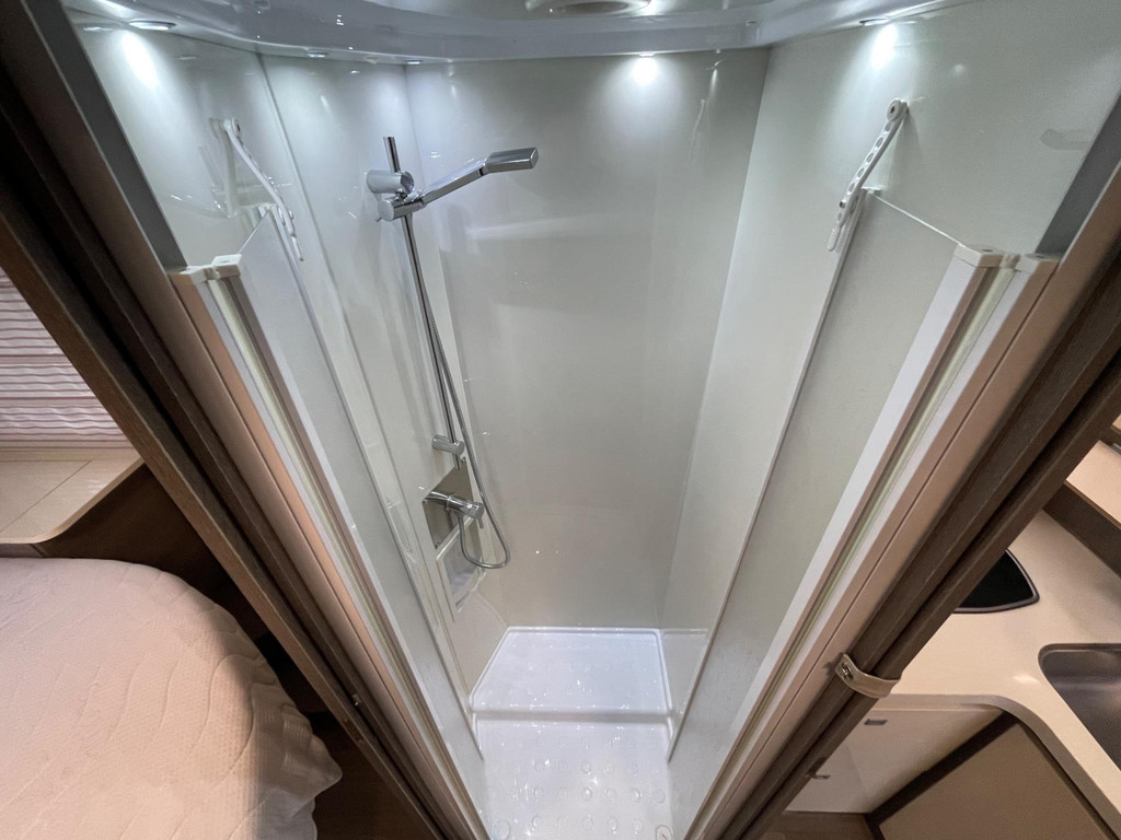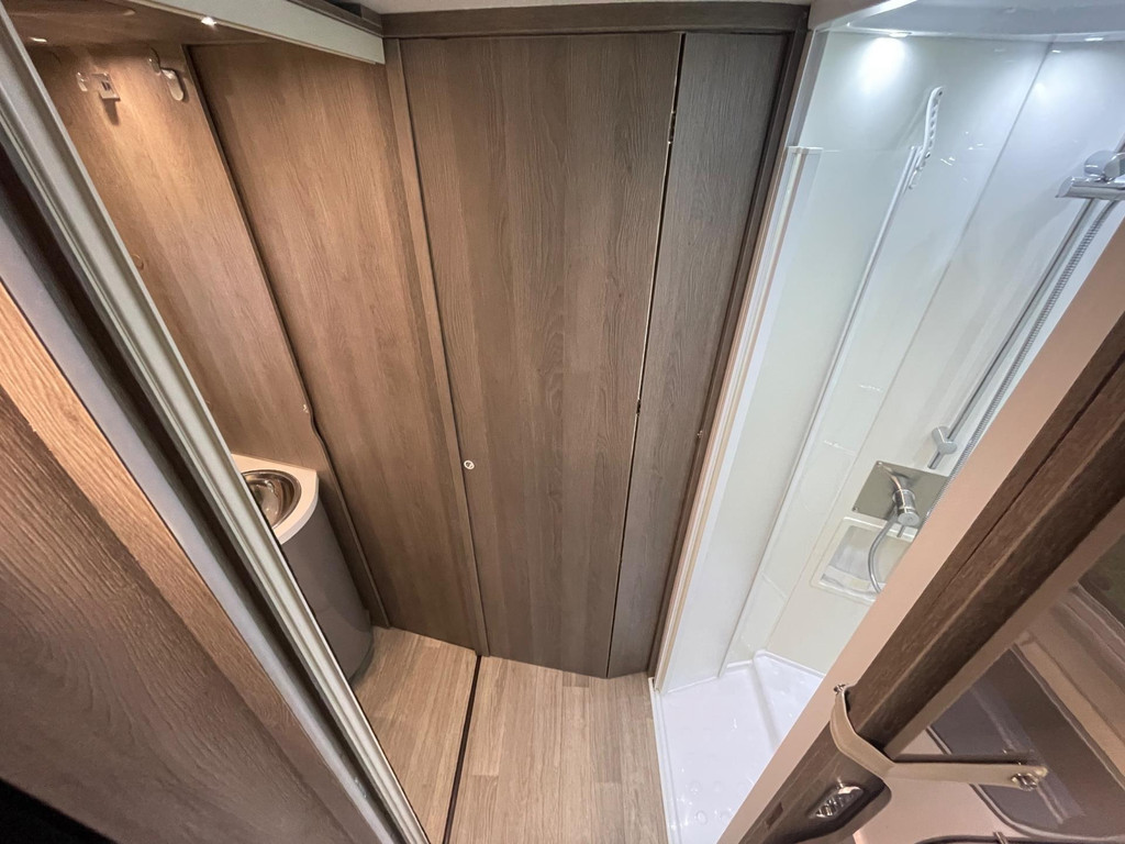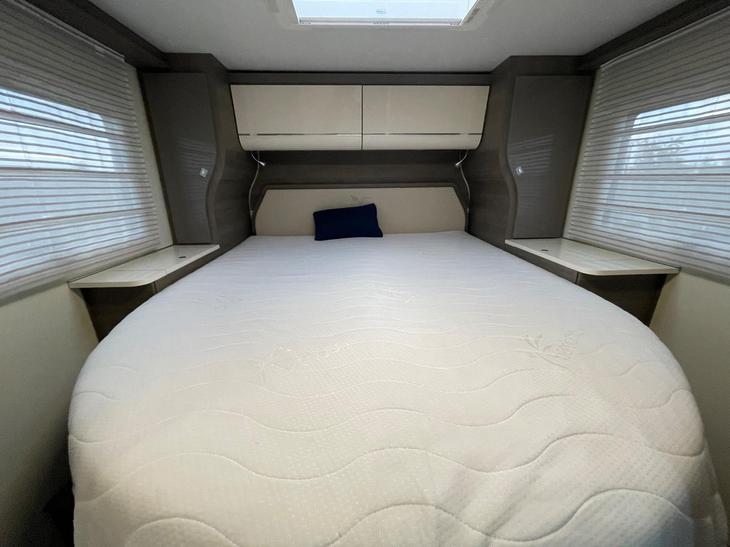 Airco woongedeelte, witte leren bekleding, televisie, schotel, zonnepaneel, fietsenrek, oven, xl koelkast + vriesvak, centrale deurvergrendeling, geurventilatie toilet, luifel, Zenec audiosysteem (nieuw) met achterrijcamara en Apple CarPlay. Indeling van de camper Zeer moderne interieur: Slaapgedeelte, Queens bed, aan beide zijde hangkasten + nachtkastjes met opbergruimte. Leeslampjes + sfeerverlichting achter het bed. Opbergruimte onder het bed. Schuifdeur om slaapgedeelte af te sluiten. Aparte douche en toilet. Schuifdeur tussen woon en wasgedeelte. Keuken 2x apothekerkasten, boven en onderkasten + besteklade, 3 pits gas toestel. Xl koelkast + extra vriesvak, gasoven. Woongedeelte: 2 banken met leren kussens, 2 verstelbare stoelen + verstelbare tafel. Verduisterend schuifsysteem voor ramen + extra zonsverduistering tijdens het rijden. 2 opbergvakken in de vloer. Hefbed met verlichting. Camper is voorzien van overal mooie sfeerverlichting. XL garage. Buitenverlichting, luifel en stopcontact buiten incl. Tv aansluiting