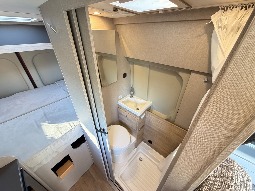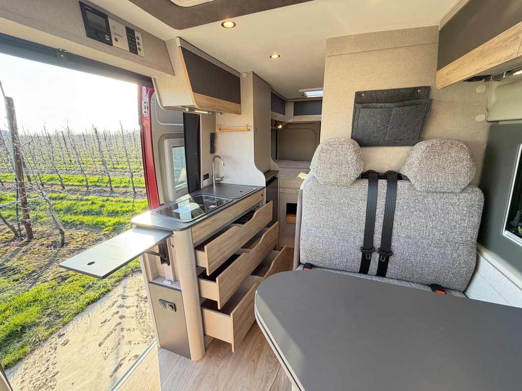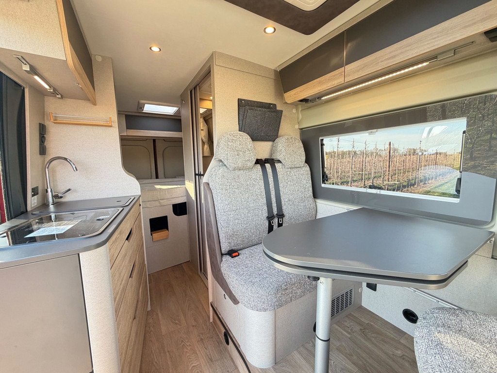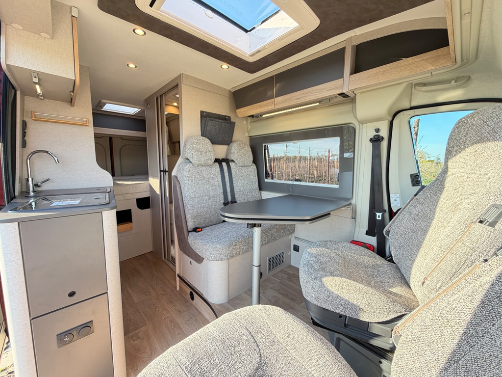 Binnen vind je een gezellige zit met draaibare stoelen, een complete keuken, een badkamer met douche en toilet, en een comfortabel bed. Alles is ontworpen om zorgeloos op reis te gaan.