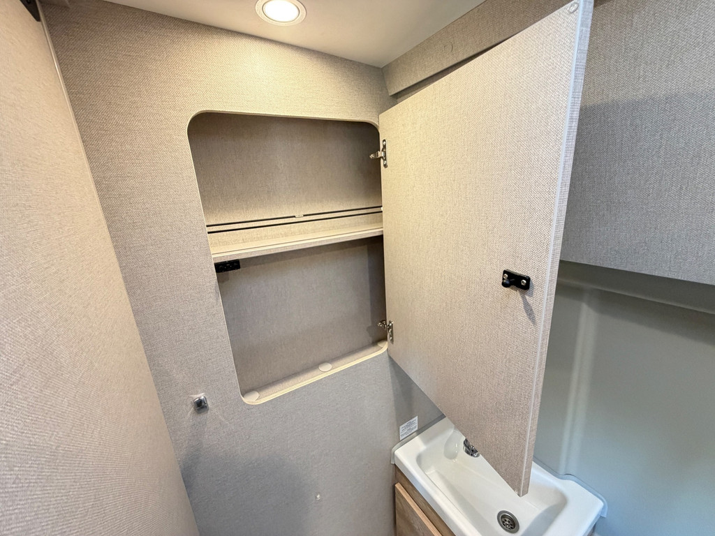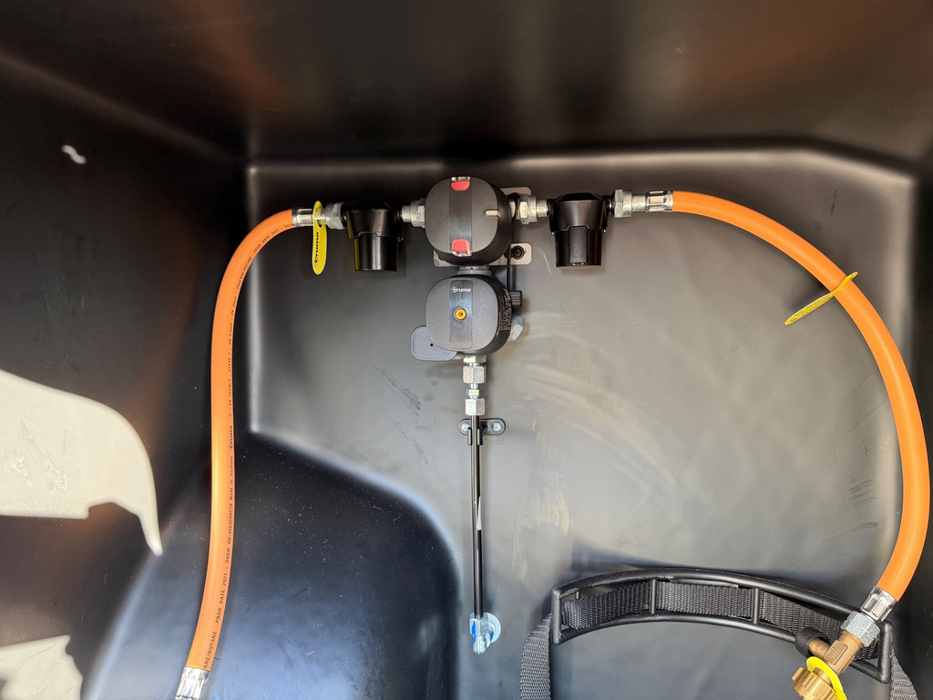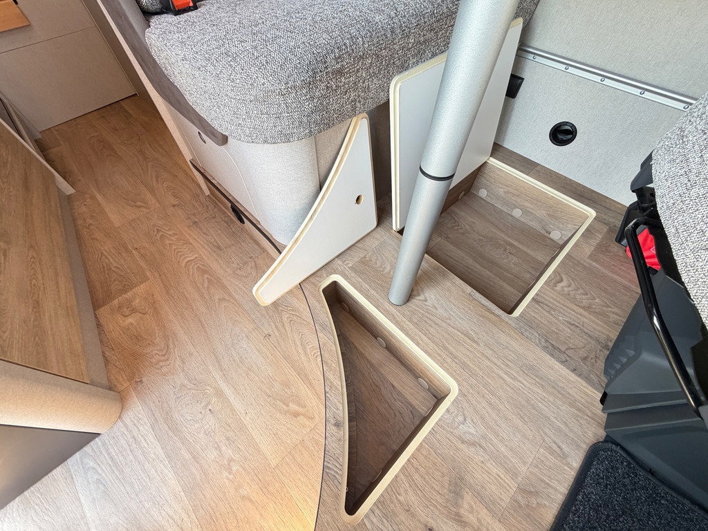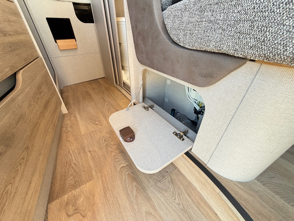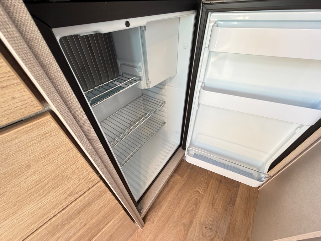 Binnen vind je een gezellige zit met draaibare stoelen, een complete keuken, een badkamer met douche en toilet, en een comfortabel bed. Alles is ontworpen om zorgeloos op reis te gaan.
