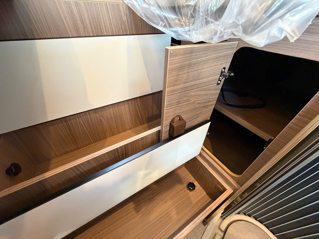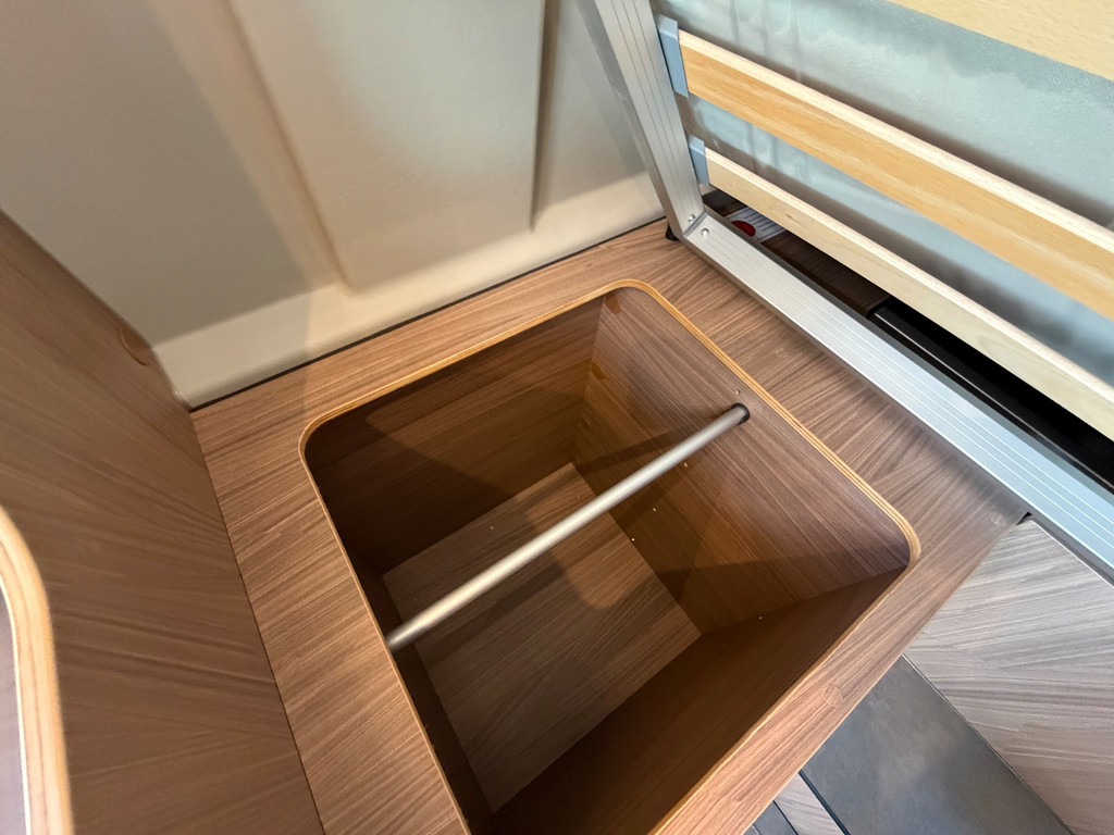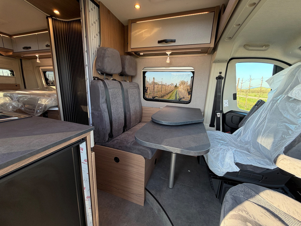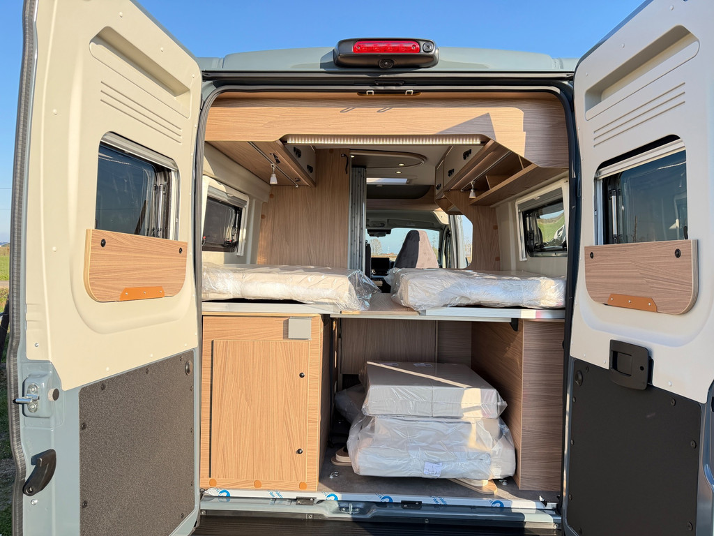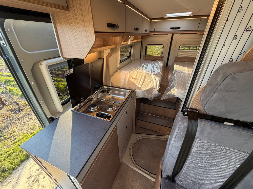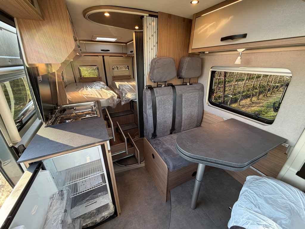 De praktische indeling bestaat uit een zitgroep (met bedverbreding en alternatieve tafel), twee achterbedden (1.930/1.800 x 829 mm) en een extra derde slaapplaats (1.800 x 700 mm). Daarmee geschikt voor drie personen.
